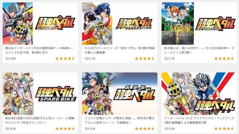 | Platform | Yowamushi Pedal (S1) | GRANDE ROAD (S2) | NEW GENERATION (S3) | GLORY LINE (S4) | LIMIT BREAK (S5) | SPARE BIKE (Spin-off) | The Movie | Recap Films |